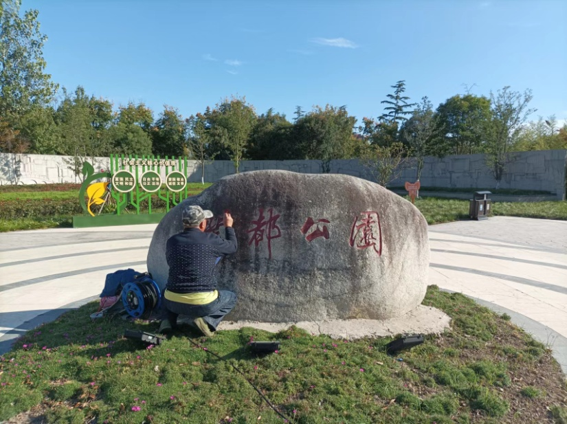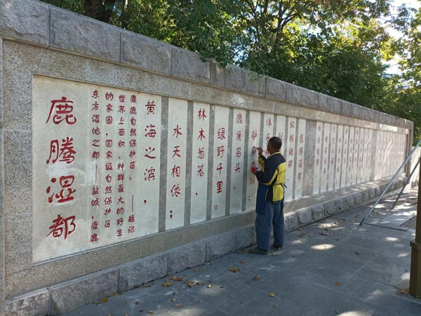 潤都公園主入口的特色浮雕景墻上嵌有“鶴舞東方”、“鹿騰濕都”等字樣,設計方案充分融入鹽城地方元素,以“鶴”、“鹿” 為主題,結合優(yōu)雅靈動的浮雕畫,突出鹽城濕地廣闊、物種豐富、生態(tài)良好的特點,充分體現(xiàn)了鹽城自然環(huán)境的優(yōu)越性。 美景共賞,更需要共同去維護。近日,公園工作人員對東門入口特色浮雕景墻和北門入口景觀石進行清洗打磨、破損修復、字樣出新等處理。翻新工作保護了經(jīng)自然侵蝕的磨損景觀,改變了長久以來暗淡的色彩,也提升了公園入口景觀效果。