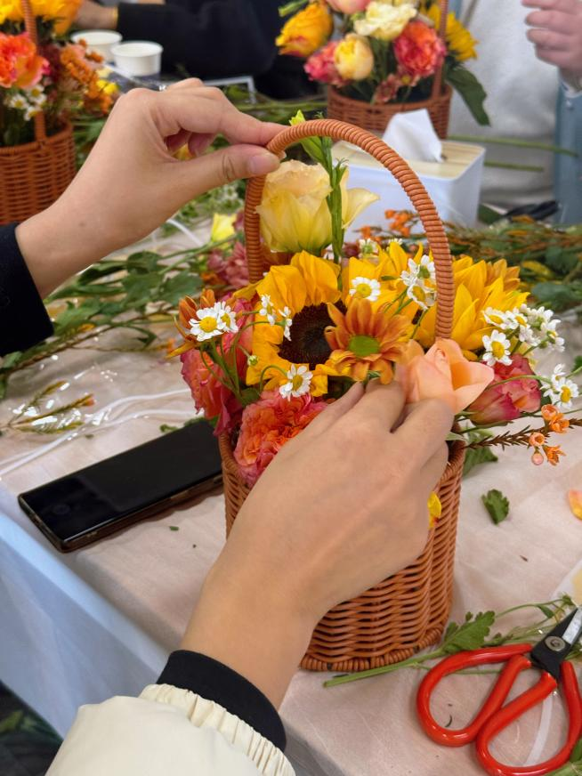 活動(dòng)現(xiàn)場(chǎng),花藝?yán)蠋?/span>從花材選取、造型設(shè)計(jì)、色彩搭配等方面進(jìn)行了講授,剪接、綁枝、造型、固定……在老師的悉心指導(dǎo)下,大家專注于手中的花草,盡情發(fā)揮、巧妙搭配,一個(gè)個(gè)錯(cuò)落有致、創(chuàng)意十足的花籃作品呈現(xiàn)在眼前,大家看著自己親手創(chuàng)作的插花作品,內(nèi)心充滿了成就感與幸福感。