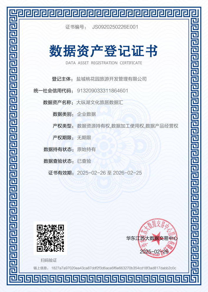 本次項(xiàng)目推進(jìn)過程中,集團(tuán)領(lǐng)導(dǎo)高度重視,以數(shù)據(jù)資產(chǎn)化試點(diǎn)項(xiàng)目為載體,構(gòu)建“政企研”協(xié)同機(jī)制,聯(lián)合華東江蘇大數(shù)據(jù)交易中心組建專項(xiàng)工作組,開展數(shù)據(jù)確權(quán)登記、質(zhì)量評(píng)估、成本核算等全鏈路標(biāo)準(zhǔn)化作業(yè)。“大縱湖文化旅居數(shù)據(jù)匯”數(shù)據(jù)資產(chǎn)成功在華東江蘇大數(shù)據(jù)交易中心完成數(shù)據(jù)資產(chǎn)登記,入表資產(chǎn)價(jià)值近千萬元,同期,成功在南京銀行鹽都支行獲得500萬元的授信貸款。集團(tuán)成功實(shí)現(xiàn)“數(shù)據(jù)資產(chǎn)登記+授信”雙重突破,貫通數(shù)據(jù)要素“資源-資產(chǎn)-資本”的三級(jí)躍升,重構(gòu)文旅企業(yè)“輕資產(chǎn)、高價(jià)值”的融資生態(tài),打造數(shù)據(jù)要素驅(qū)動(dòng)產(chǎn)業(yè)升級(jí)的行業(yè)標(biāo)桿樣本。